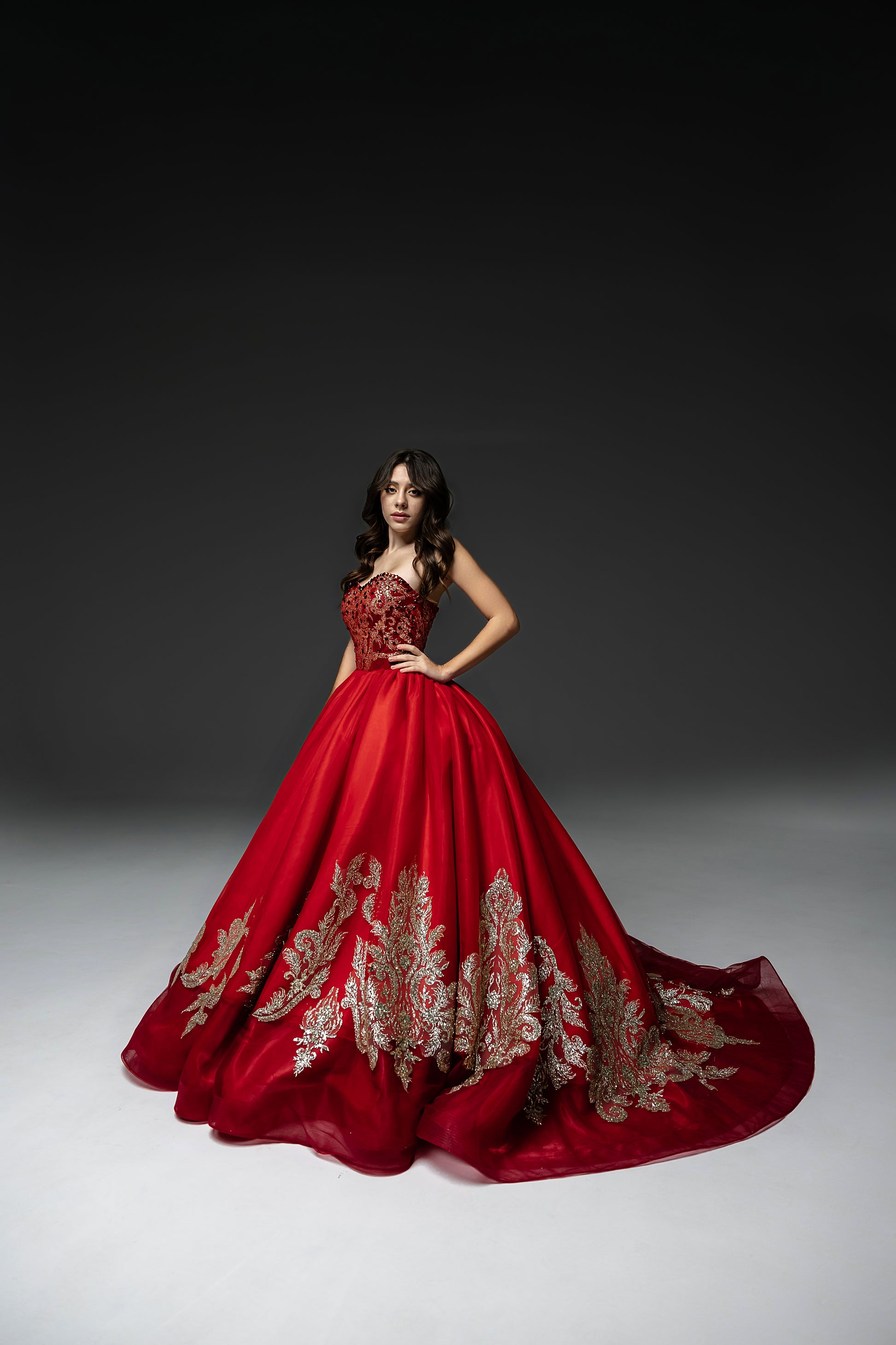 Red Gala Pageant evening gown an opulent masterpiece crafter for the elite special occasions, Red Carper events, - with gold laced skirt and bodice, with spectacular train. Each lace patern is meticulously hand-sewn, ensuring no two gowns are exactly alike. Perfect for gala nights, this gown guarantees an unforgettable entrance.