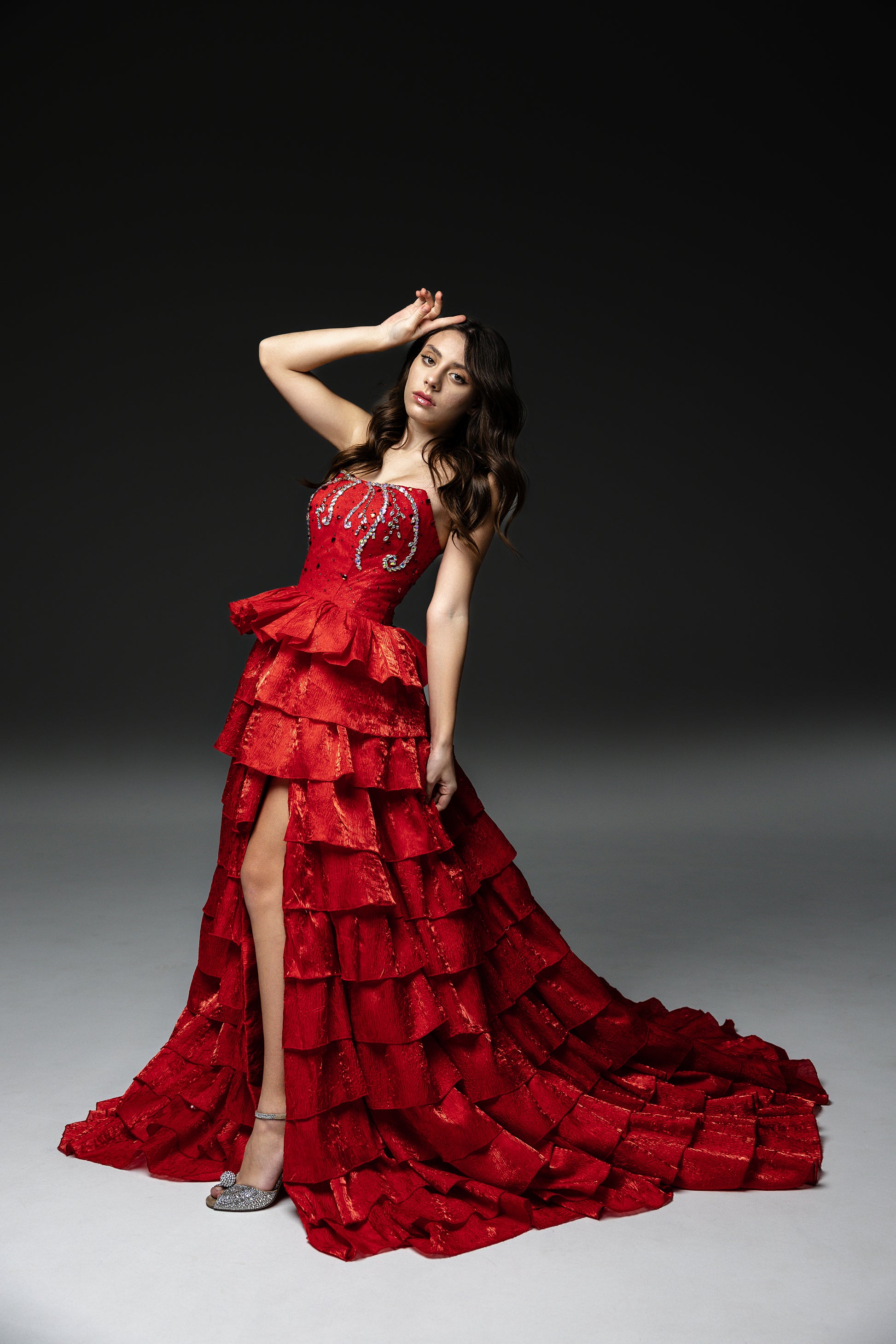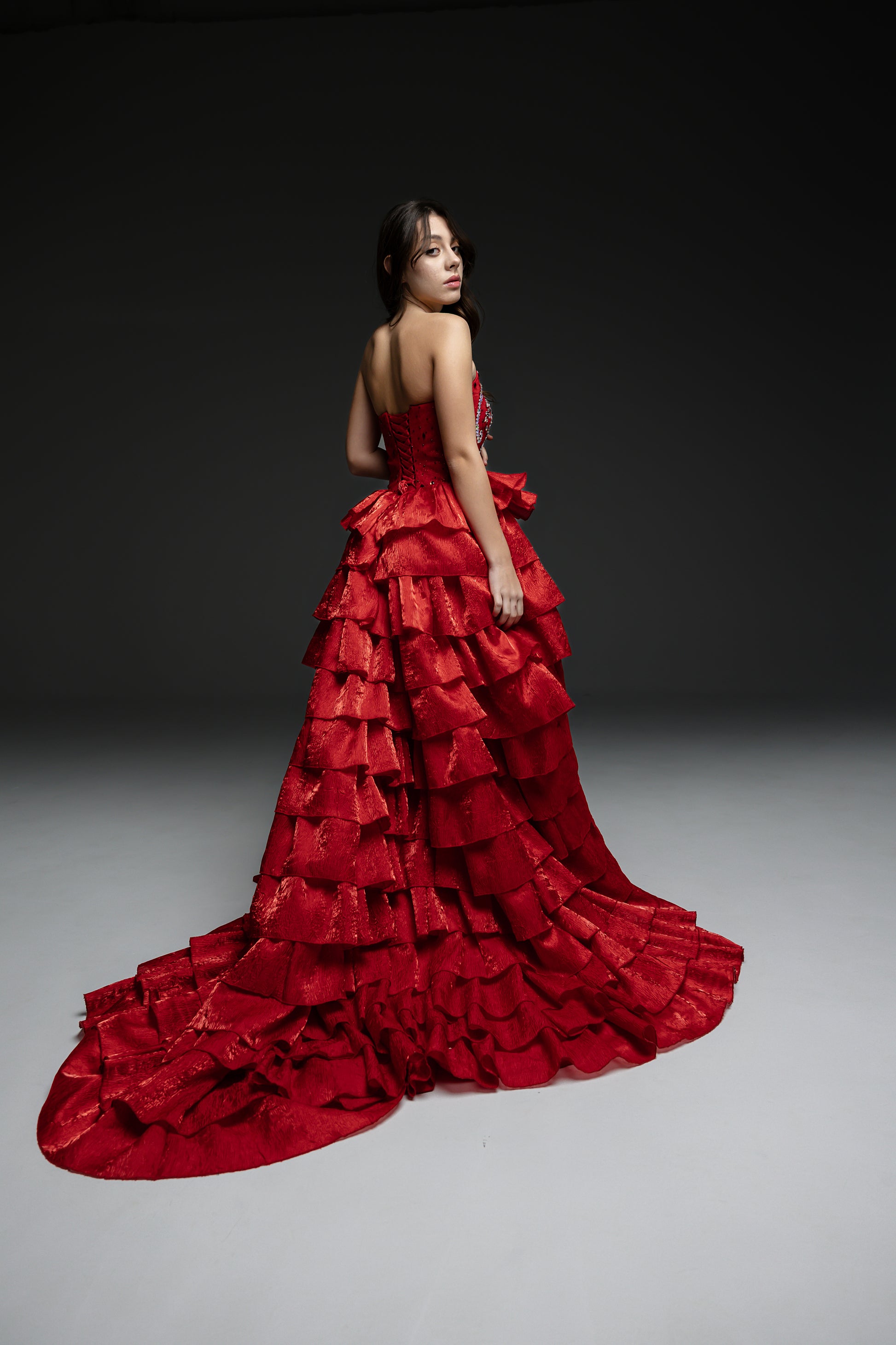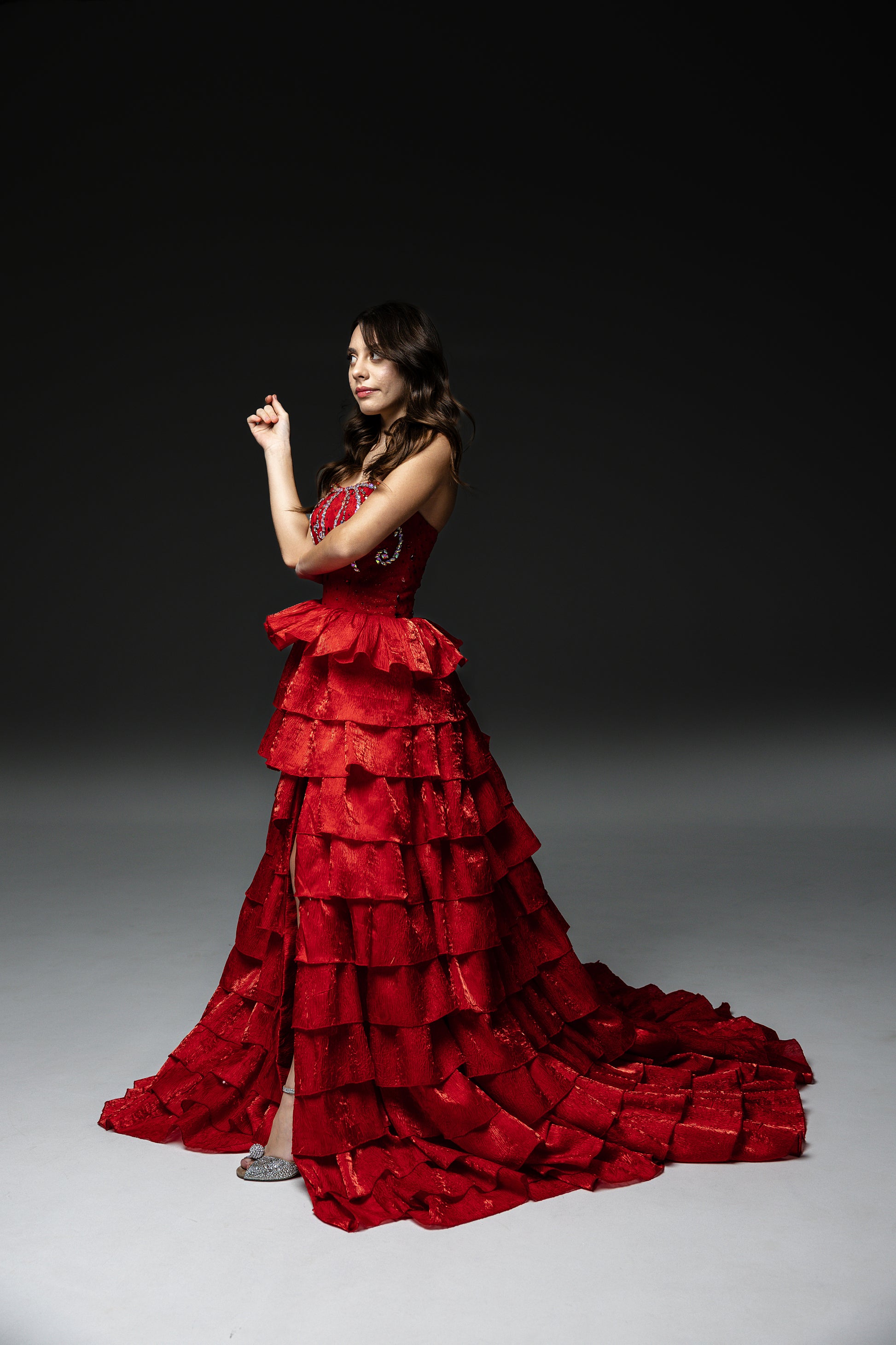 Red Gala Pageant evening gown an opulent masterpiece crafter for the elite special occasions, Red Carper events, - with gold laced skirt and bodice, with spectacular train. Bodice is meticulously hand-sewn, ensuring no two gowns are exactly alike. Perfect for gala nights, this gown guarantees an unforgettable entrance.