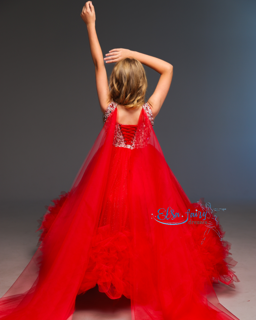 Red pageant chiffon girl dress with beaded shoulders and waist, flower girl dress, long formal wear, organza tulle dress, birthday ball gown