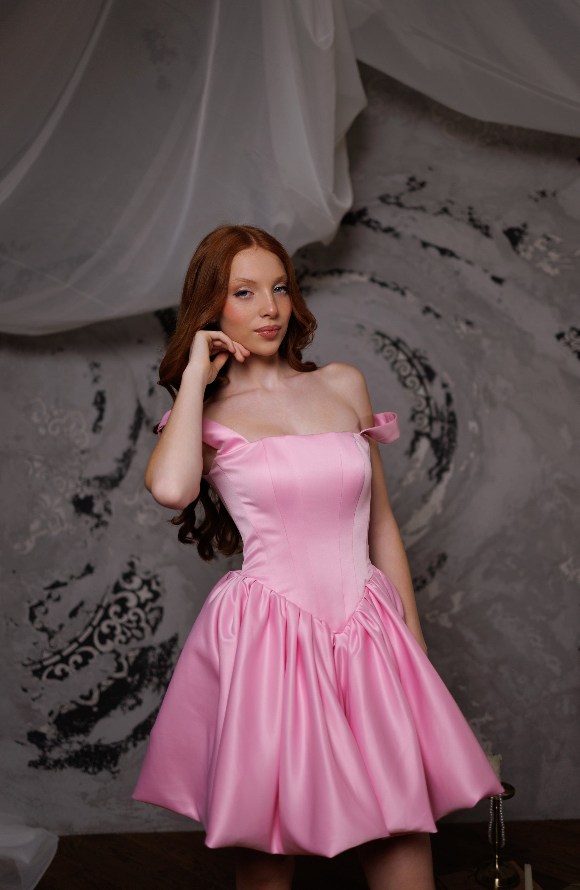 Made from luminous white satin, this dress features refined couture-inspired lines and a clean, modern structure. The bodice is precisely tailored with sculpted seams that softly shape a sweetheart neckline. A statement bubble skirt adds volume and a contemporary silhouette, supported by inner construction that maintains its beautifully defined form. Understated yet eye-catching, this design offers polished elegance—perfect for winter celebrations, photoshoots, or memorable special occasions.